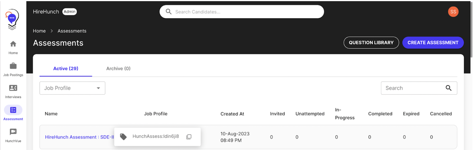 - To retrieve the relevant assessment ID in HireHunch, click on the HunchAssess (Assessment) tab.