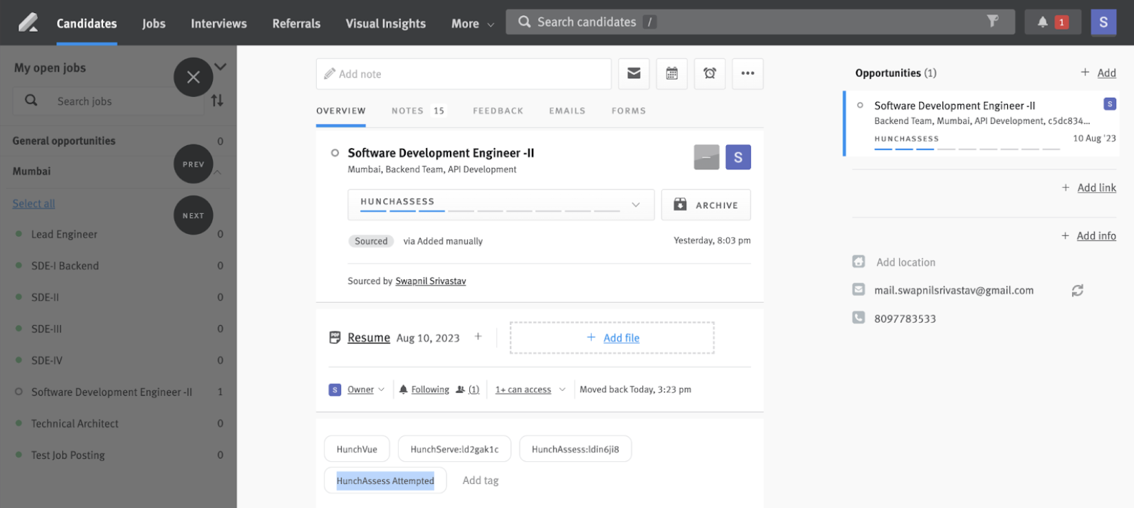 - In Lever, assign the candidate to a HunchAssess associated Job (the job posting must contain the HunchAssess Tag).