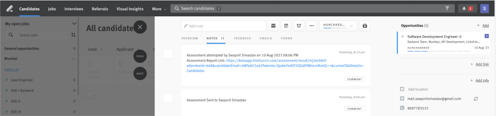 - Once the candidate completes the assessment, a tag ‘HunchAssess Attempted’ will be added and results will be updated on the candidate application.