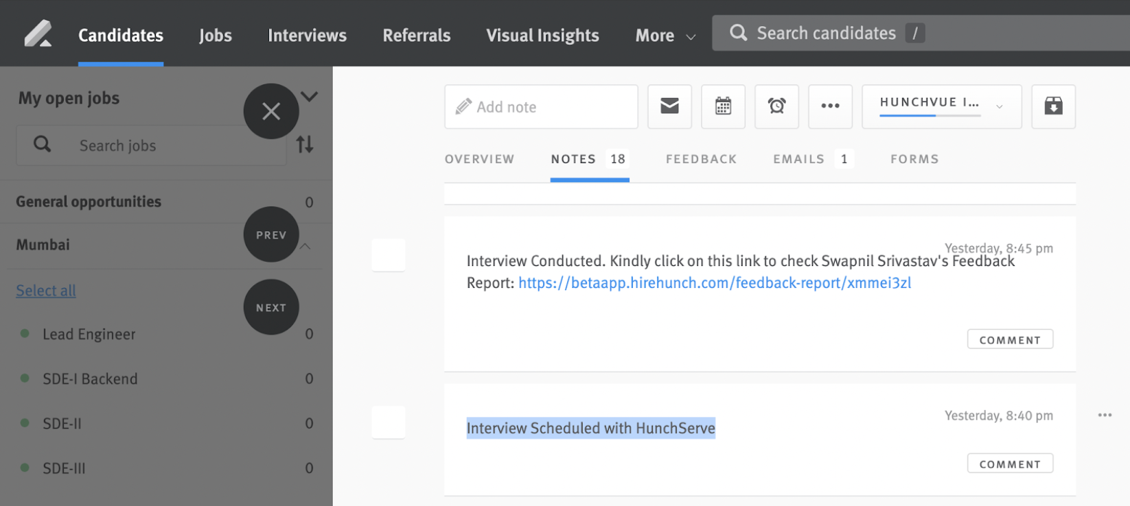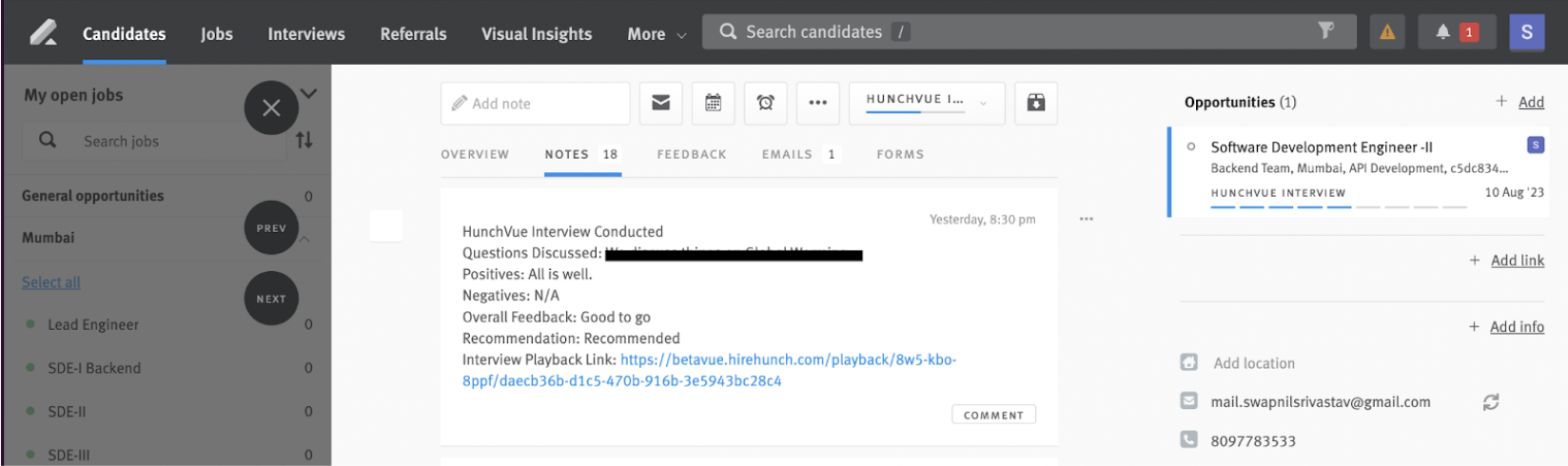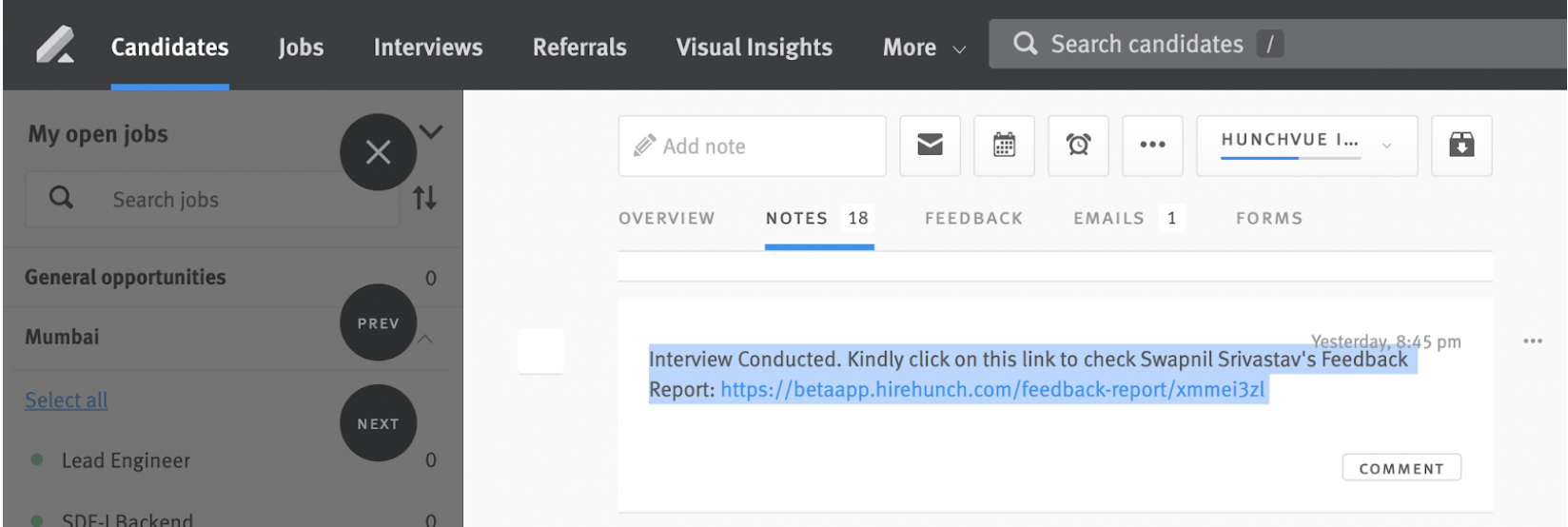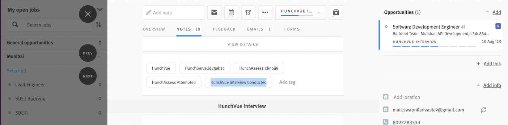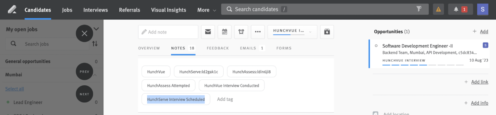 - Once the interview is completed for any candidate, the tag ‘HunchServe Interview Conducted’ and a note containing a link to the candidate’s feedback report will be pushed to the candidate’s opportunity in Lever.