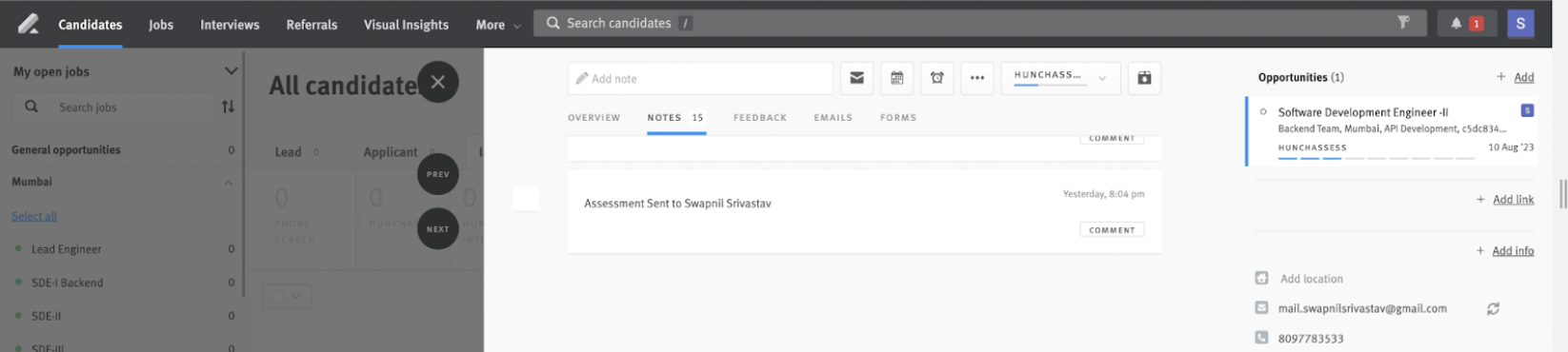 - Move the candidate to the HunchAssess stage (trigger stage) in Lever.