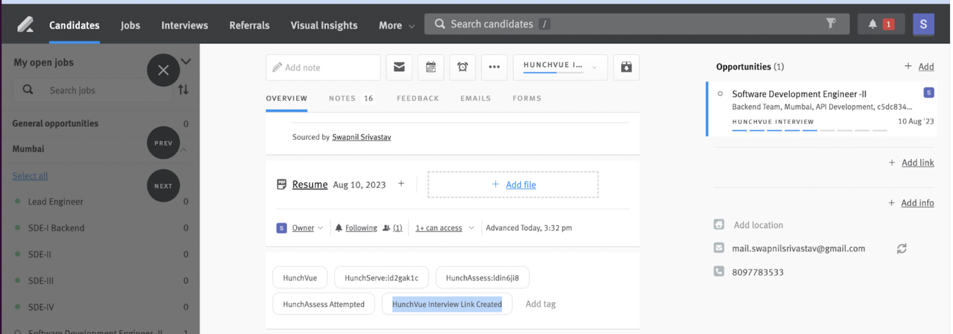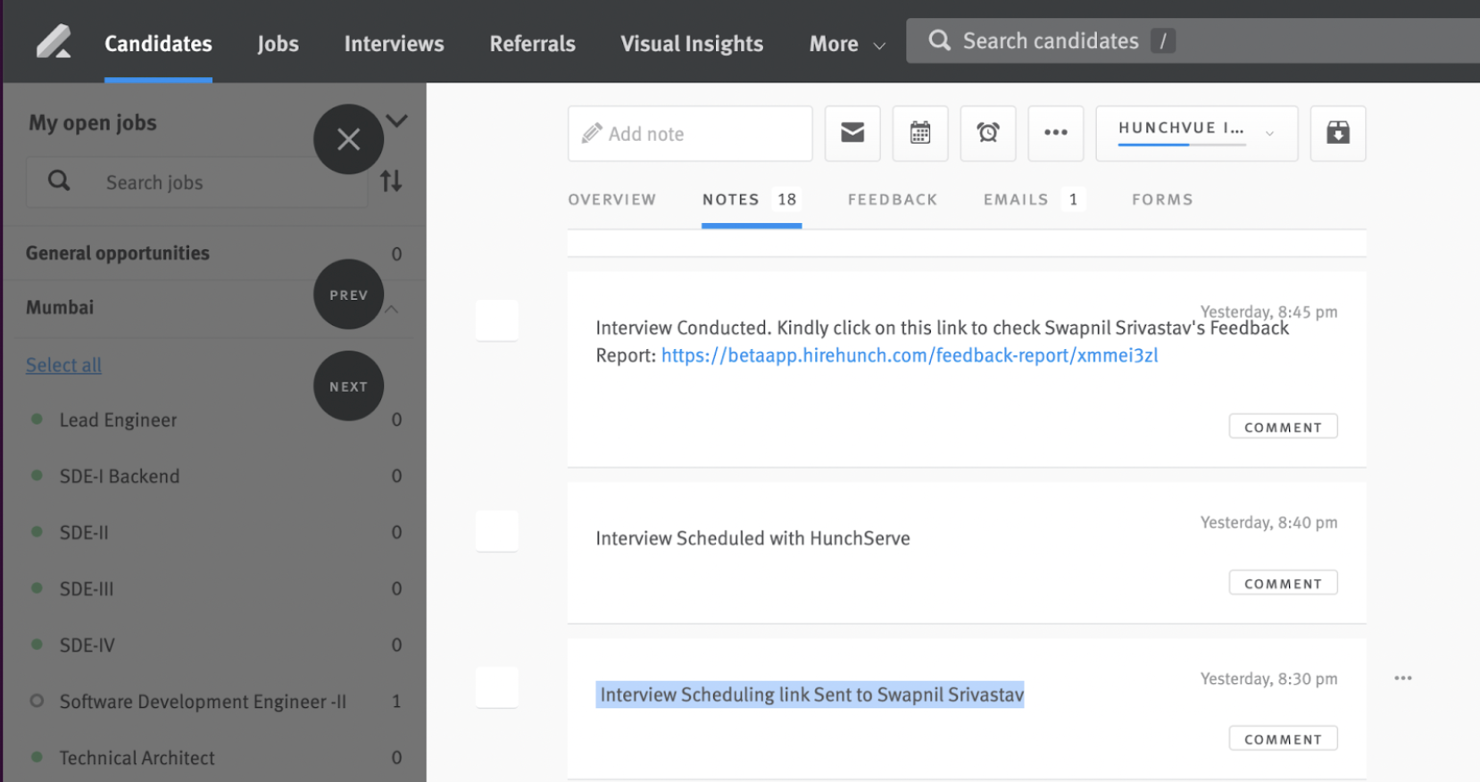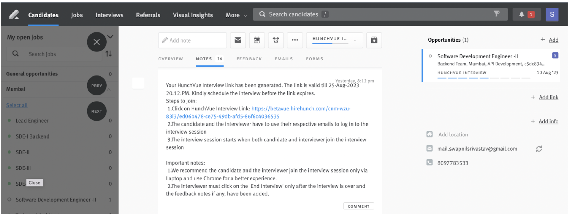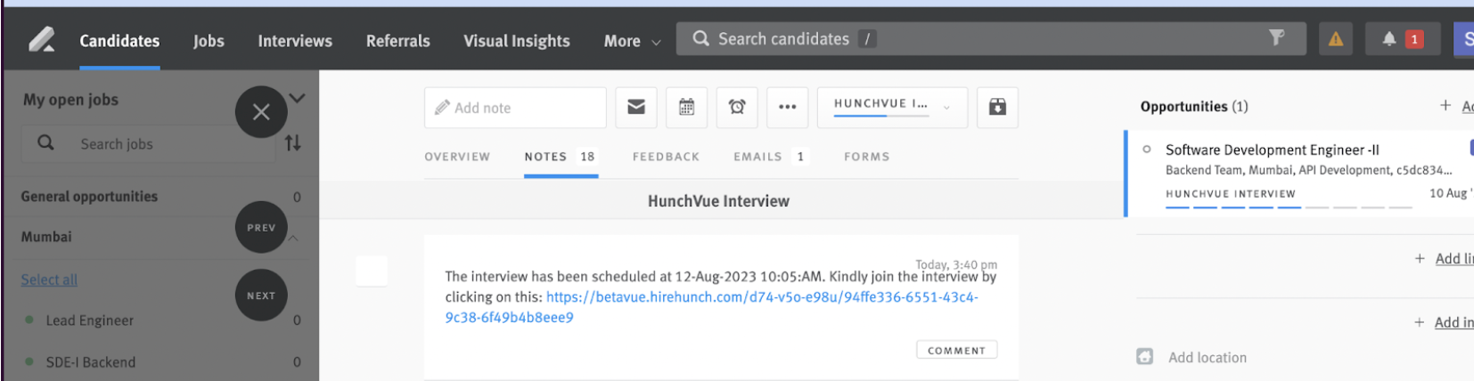 - The candidate opportunity will show a tag ‘HunchVue Interview Link Created’ along with a note with HunchVue interview link and instructions to join the interview.