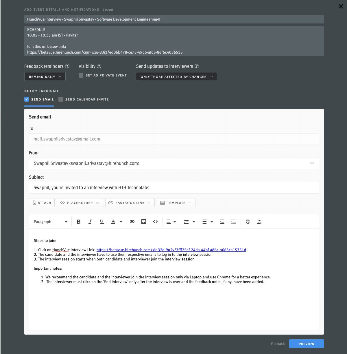Please ensure that you email the candidate the interview link and instructions. HireHunch will not send an interview invitation to the candidate. |