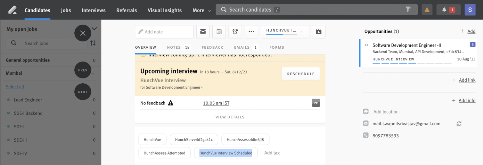 - The tech interview with HireHunch’s expert interviewer will get scheduled. The candidate opportunity will be updated with a tag ‘HunchServe Interview Scheduled’ and a note.