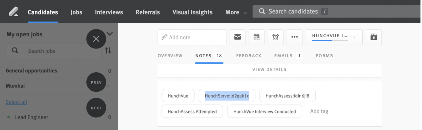 - The integration will add the tag ‘HunchVue Interview Scheduled’ and a note to the candidate opportunity in Lever.