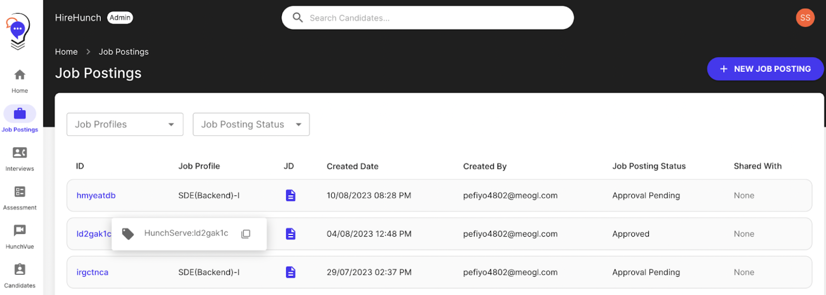 - To retrieve the relevant Job ID in HireHunch, go to the Job Posting screen from the left menu on the HireHunch portal.