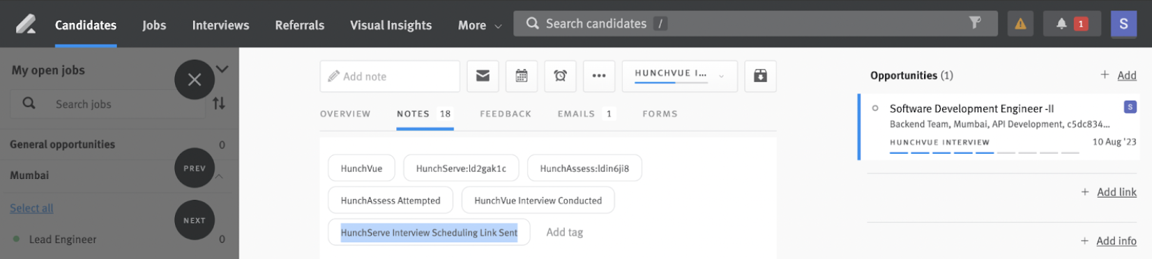 - The integration will also update the the Lever opportunity with the tag ‘HunchServe Interview Scheduling Link Sent’ and a note will be added to signify the same.