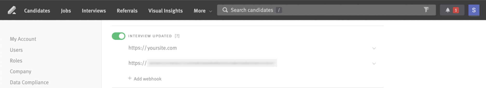 - Create a new 'INTERVIEW UPDATED' webhook in Lever by clicking + Add webhook under the 'INTERVIEW UPDATED' webhook
