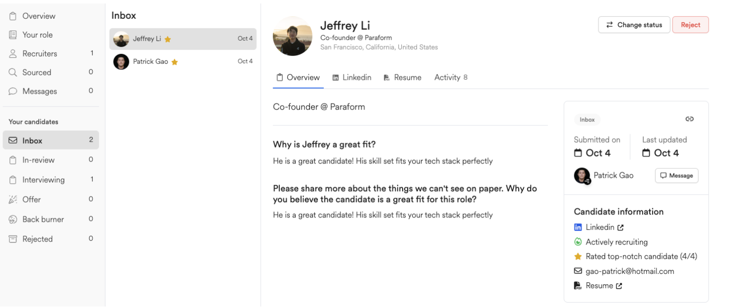 • The integration will upload the candidate's email, LinkedIn profile and a link to their application on Paraform.