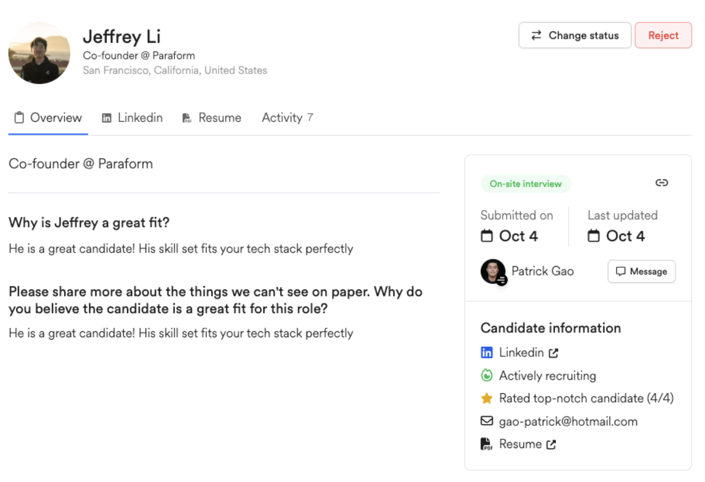 Candidate on Paraform is also moved to ‘On-site interview’ stage: