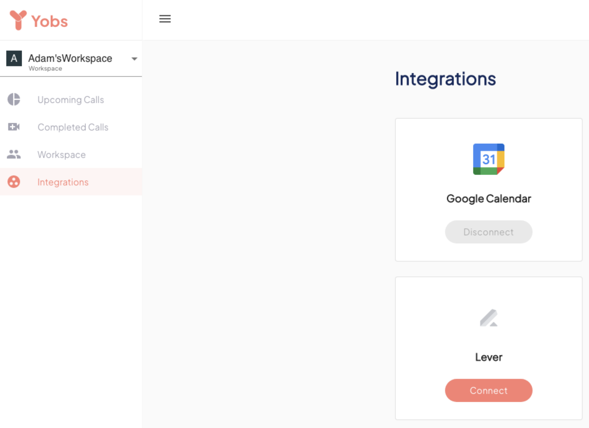 - In Yobs, navigate to the Integrations tab and click Connect under the Lever log